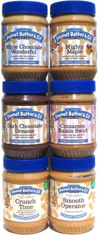 Peanut Butter & Co.`s no-stir formula is perfect for baking, sandwiches, or straight out of the jar! Available in six funky flavors. No gluten, refined sugars, trans fats, hydrogenated oils, or high fructose corn syrup; Kosher. 16 oz. jar. Ingredients: (Cinnamon Raisin Swirl): Peanuts, evaporated cane juice, raisins, cinnamon, organic palm oil, salt. (White Chocolate Wonderful): Peanuts, evaporated cane juice, vanilla, cocoa butter, organic palm oil, lecithin, salt. (Dark Chocolate Dreams): Peanuts, evaporated cane juice, cocoa, cocoa butter, palm fruit oil, vanilla, lecithin (from sunflowers), salt. (Mighty Maple): Peanuts, evaporated cane juice, maple syrup, natural maple flavor, palm fruit oil, salt. (Smooth Operator): Peanuts, evaporated cane juice, palm fruit oil, salt. (Crunch Time): Peanuts, evaporated cane juice, palm fruit oil, salt.